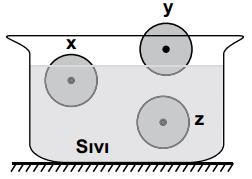 Farklı maddelerden yapılmış eşit hacimli ve sıvıda çözünmeyen x, y, z katı cisimlerinin sıvı içindeki denge konumları şekildeki gibidir.