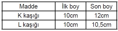 Kaşıkların işlem öncesi uzunlukları ve işlem sonrası uzunlukları tablodaki gibi kaydediliyor.