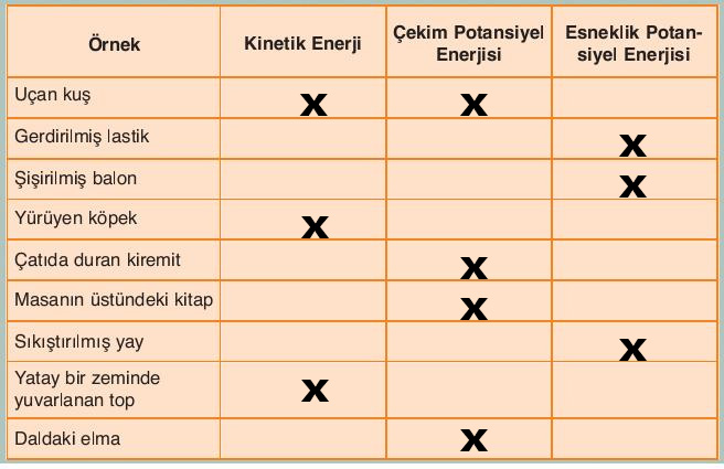 Tabloda verilen örneklerin hangi enerji türüne ya da türlerine örnek olduğunu tabloda işaretleyiniz.