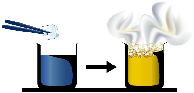 Aşağıdaki görselde bromtimol mavisi indikatörü damlatılan beher içindeki suya kuru buz eklenmesi ve ardından gaz çıkışıyla birlikte çözeltideki indikatör renginde yaşanan değişim gösterilmiştir.
